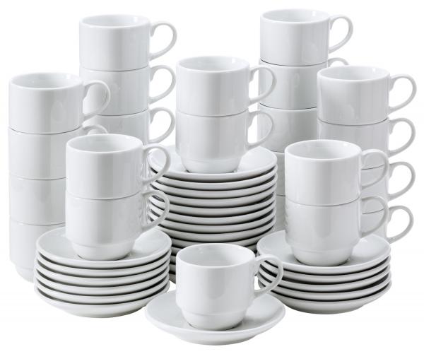 Klasični servis za kafu od gastronomskog porcelana. Super-paket od 50 komada sastoji se od 25 šoljica za kafu / tanjira. Prečnik tanjira za kafu 13,5 cm. Može se slagati, može se koristiti u mikrotalasnoj pećnici i može se prati u mašini za suđe.