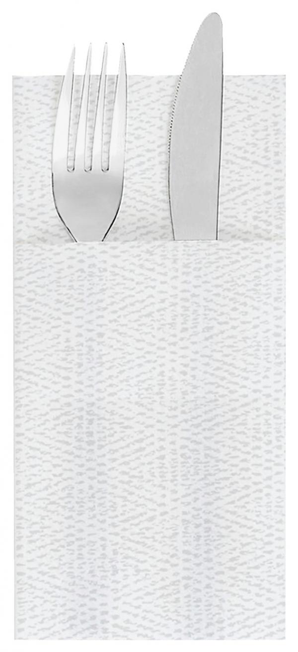 Torba za pribor za jelo od netkanog materijala. Može se koristiti kao salveta kada je rasklopljena. 40k40 cm rasklopljen. Biorazgradivo i kompostabilno. Materijal: Spunlace netkana tkanina (70 g/m²).