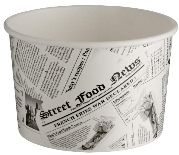 Idealno za uličnu prodaju. Pogodno za mikrotalasnu pećnicu, frižider i zamrzivač. Za hladnu i toplu hranu. Poklopac je pogodan za sve veličine. Moderan dizajn u novinskoj optici. Materijal šolje: čvrst karton otporan na masnoću. Poklopac: plastika!