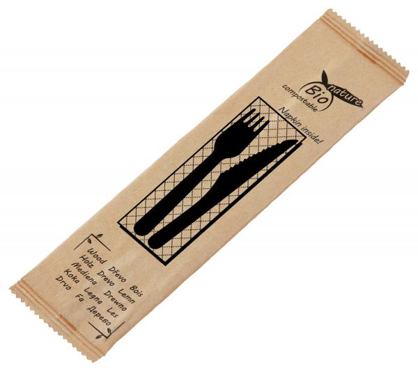 Set pribora za jelo koji se sastoji od noža i viljuške od brezovog drveta i salvete od celuloze 24k24 cm, biorazgradivo i kompostirano.