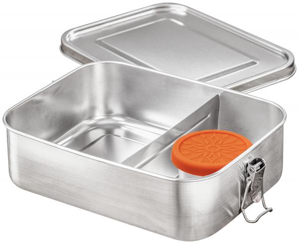 Kutije za višekratnu upotrebu od nerđajućeg čelika 18/8. Bento kutije sa higijenskom površinom savršene su za čuvanje raznovrsne hrane. Čvrsto zaptivni silikonski prsten osigurava da je sadržaj zaštićen. Zbog zaptivnog prstena u poklopcu i fleksibilnog separatora, tečna hrana ili različite komponente se takođe mogu transportovati bez ikakvih problema. Incl. 1k separator i 1k mini kutija za užinu 100 ml sa silikonskim poklopcem za npr. dipovi, prelivi i sosovi. Pogodno za mašinu za pranje suđa.