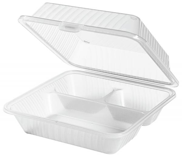 Održiva alternativa ambalaži za jednokratnu upotrebu. Polipropilenska kutija za višekratnu upotrebu sa tri pregrade, idealna za upotrebu u sektoru hrane za ponijeti. Može se prati u mašini za suđe, može se slagati, čvrsta, bez BPA.