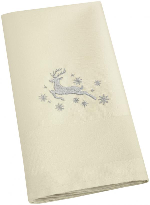 Salveta sa izvezenim jelenskim motivom. Svijetlo obojena, briljantan sjaj i klasični Atlas dizajn. 100% pamuk, 60°C pranje.