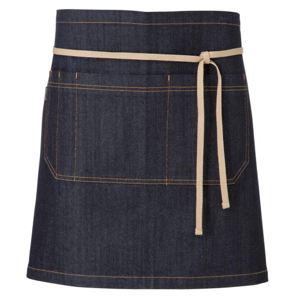 100% Pamuk. 340 g/m². Pranje na 40°C.Prava teksas kecelja sa dvodijelnim prednjim džepom, dva džepa za olovke i uskim rebrastim strukom.