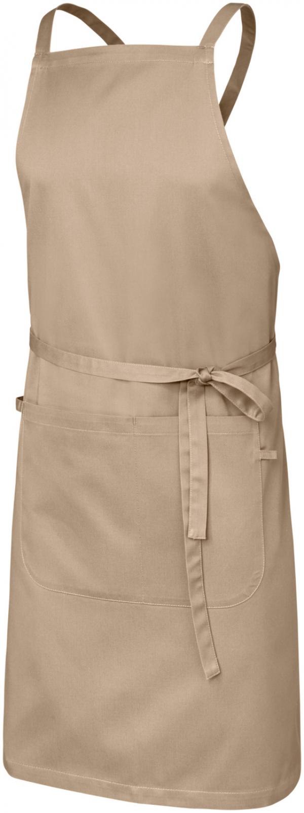 Klasična kecelja od visokokvalitetne i izdržljive miješane tkanine. Sa fiksnim trakama od tkanine za kecelje, koje su ukrštene pozadi da rasterećuju vrat. Sadrži petlju za kuhinjski peškir, jezičak za olovku i veliki džep sa dva dijela. Izuzetno izdržljive, lake za njegu i lako se peglaju.