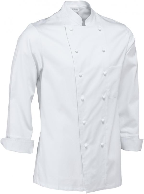 Moderna, izdržljiva muška kuvarska jakna sa dugim rukavima od pamuka koji se lako održava. Sa duplim zatvaranjem sa 6 dugmadi, duplim kopčom i dugmadima koja se mogu ukloniti. Sa zakrpanim džepom na grudima i udobnim prorezima pozadi. Takođe dostupan u polurukavu. Ravan, udoban kroj sa maksimalnom slobodom kretanja.