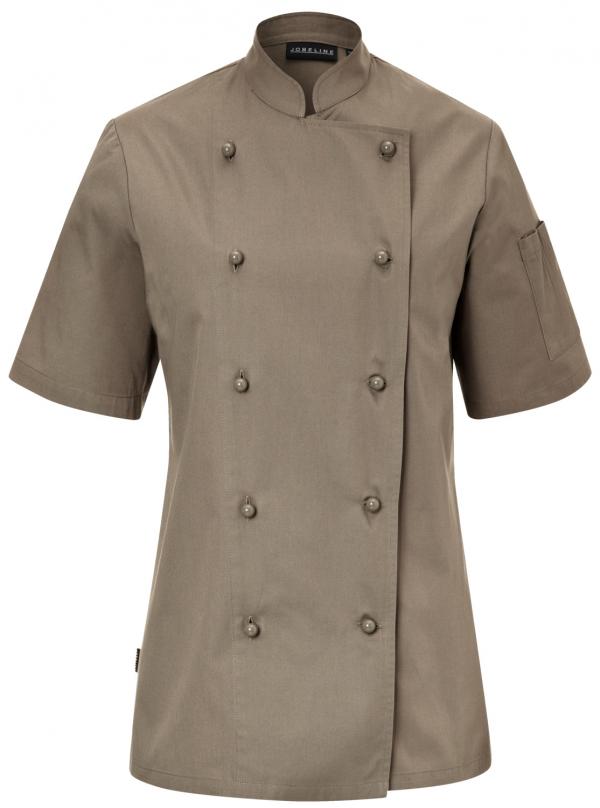 Ženska kuvarska jakna kratkih rukava od izuzetno lagane i čvrste tkanine. Sa uspravnom kragnom i dvodijelnim džepom na nadlaktici. Blago strukirani kroj. Isporuka uključuje odgovarajuća dugmad.