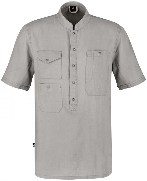 Lagana muška majica kratkih rukava od čvrstog i prozračnog pamučnog platna. Sa stojećom kragnom, tri džepa sa zakrpama sa dugmadima i omčom na vratu. Duboka dugmad na prednjoj strani sa visokokvalitetnim kopčama olakšava oblačenje preko glave. Pravi rez.