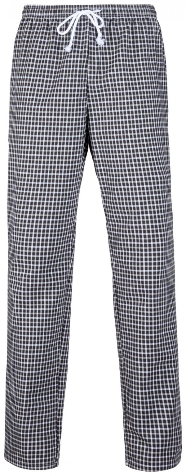 65% poliester, 35% pamuk, 180 g/m², pranje na 60 °C. Crno-bijele muđke kuvarske pantalone sa dva bočna džepa i jednim zadnjim džepom. Pojas sa elastičnim i vučnim žicama.