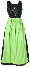 Duga haljina sa gornjim dijelom tamnocrvene boje napravljenim od perivog lovačkog platna sa suptilnim cvetnim printom, plus tamnozelena tačkasta suknja i cvijetna kecelja u bordo boji. Dekoltea sa uskim tamnozelenim cijevima i odgovarajućom somotnom aplikacijom skroz u krug. Oblikovani šavovi u gornjem dijelu, kopčanje elegantnim metalnim dugmadima na prednjoj strani. Praktičan i odvojiv dvodijelni džep na kecelji. Isporučuje se sa keceljom.