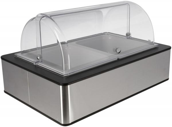 Set se sastoji od buffet kutije visoke izrađene od visokokvalitetnog brušenog 18/10 nehrđajućeg čelika sa laminatnim poklopcem boje antrakita, osnovnog kontejnera izrađenog od visoko kvalitetnog brušenog čelika.kvalitetna plastika sa toplotnom otpornošću do 70°C, odgovarajući hladni paket napravljen od polietilena, 2x bijeli, 10 cm dubok.