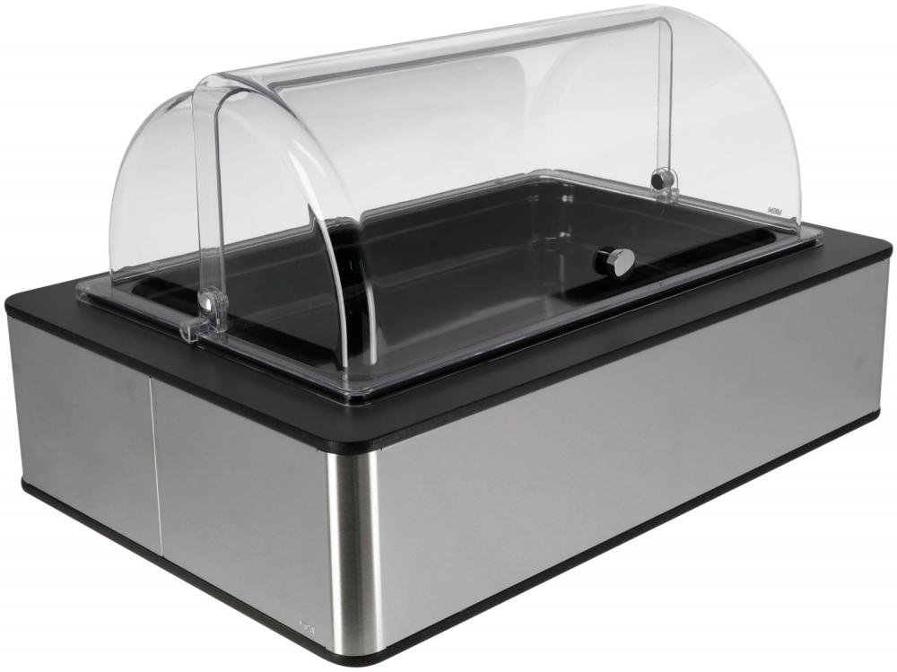 Set se sastoji od buffet kutije visoke izrađene od visokokvalitetnog brušenog 18/10 nehrđajućeg čelika sa laminatnim poklopcem boje antrakita, osnovnog kontejnera izrađenog od visokokvalitetne plastike sa toplotnom otpornošću do 70°C, odgovarajućeg hladnog pakovanja napravljenog od polietilena, crne, 6.5 cm dubok.