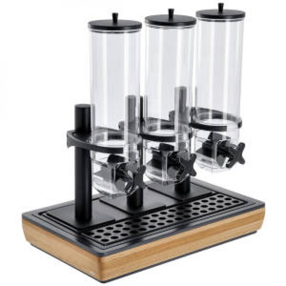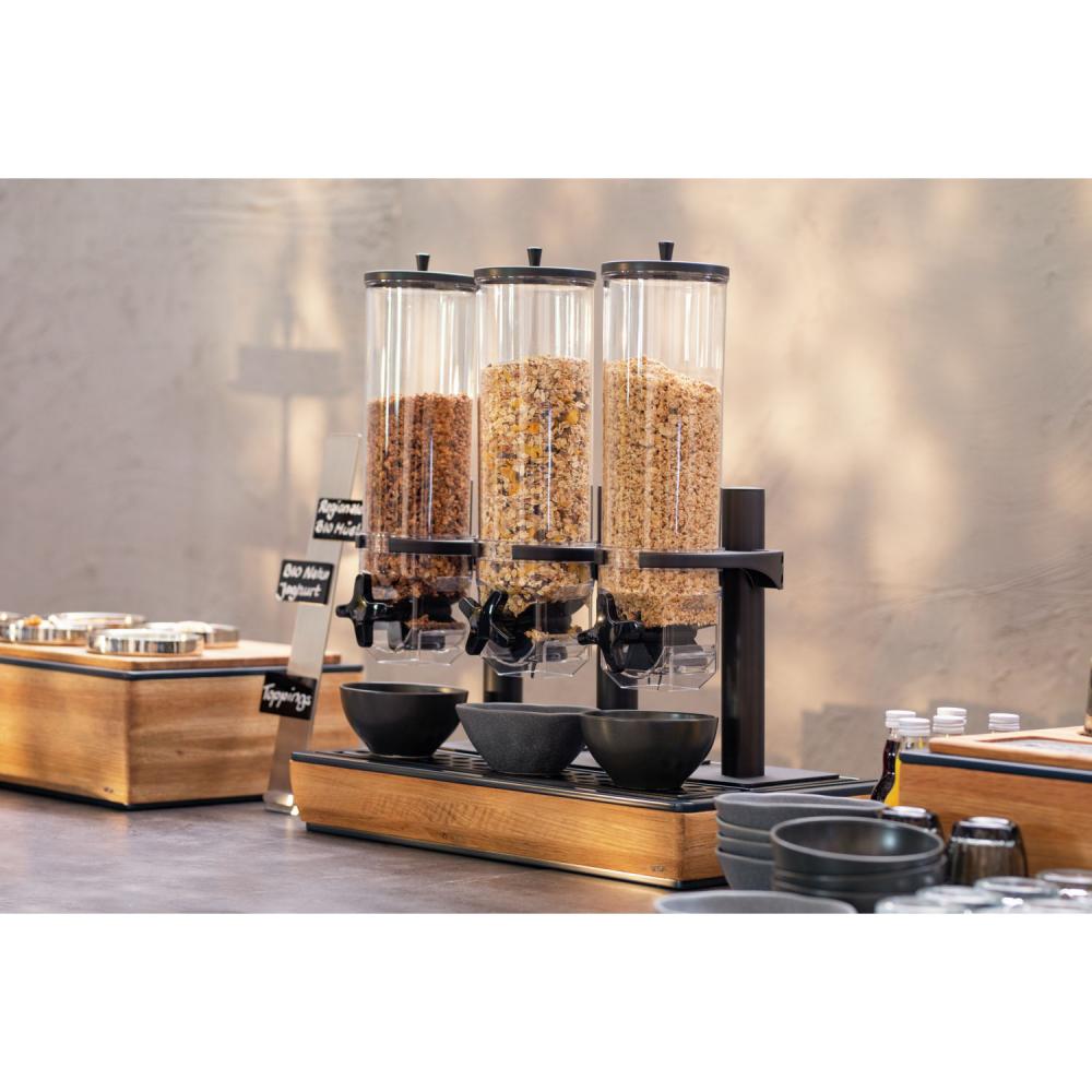 Set za doziranje žitarica sastoji se od bife kutije 1/1 od punog hrastovog drveta sa MDF panelom, donjeg kontejnera od visokokvalitetne plastike otporne na toplotu do 70°C i trostrukog Hamshire dozatora od posebno otpornog na lomljenje. i Tritan otporan na ogrebotine (bez bisfenola A) u sopstvenom dizajnu. Kapacitet 3x4 l. Udaljenost između baze i žlijeba je pribl. 10 cm. Sa silikonskim točkom za doziranje glatkog pokreta, uklonjivim, hermetičkim poklopcem i posudom za kapanje od nerđajućeg čelika 18/10. Dozator se isporučuje sastavljen. Posuda za kapanje je pogodna za mašinu za pranje sudova, svi ostali delovi nisu.