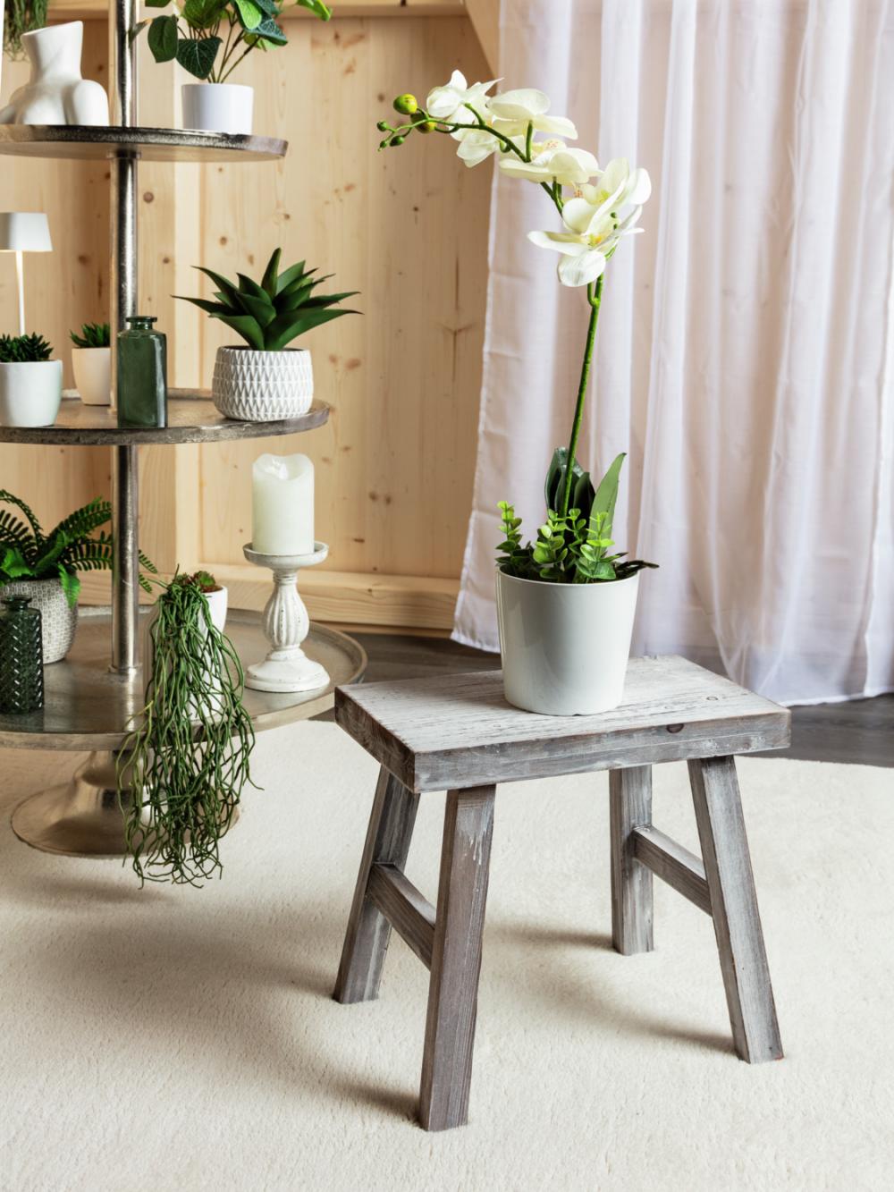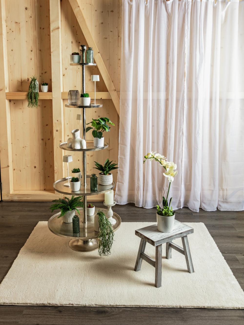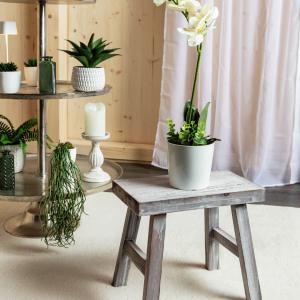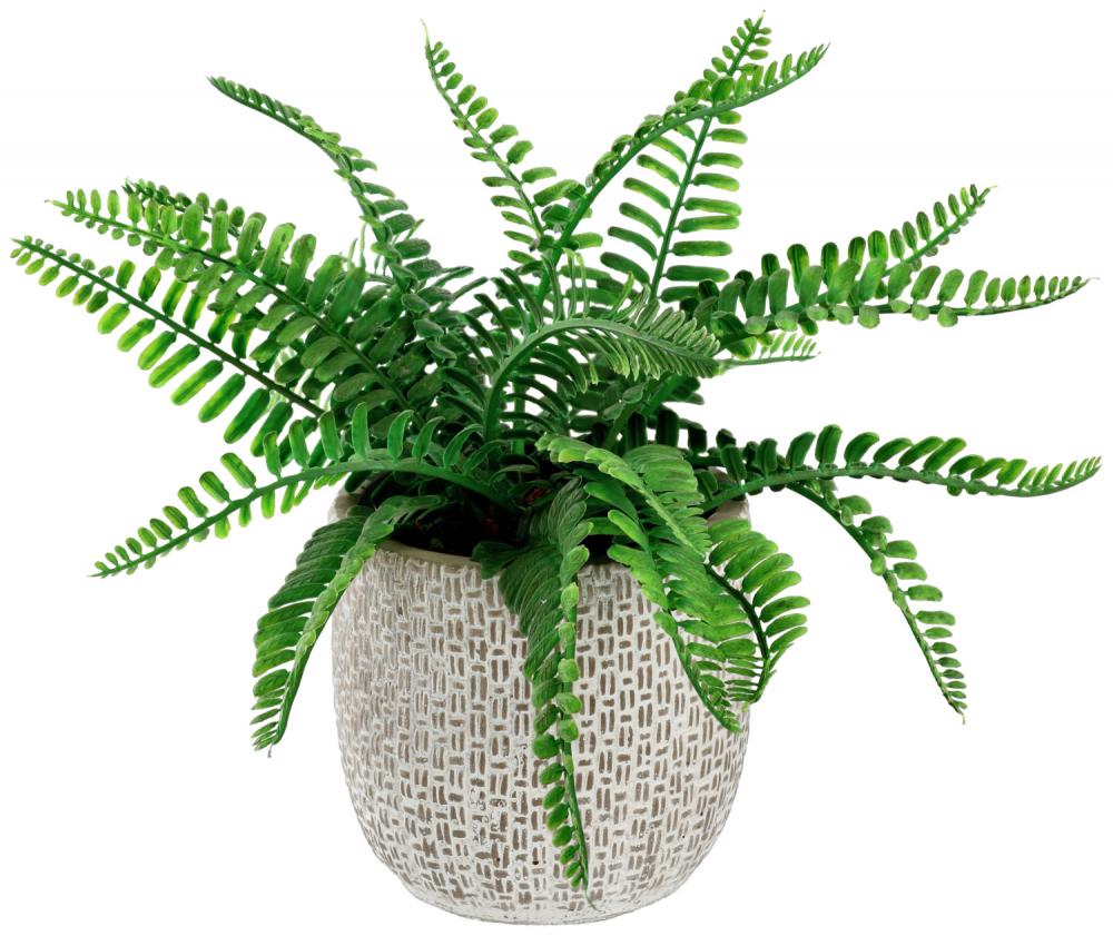 Fern made of plastic, with cement pot. For indoor and protected outdoor areas. Can be wiped with a damp cloth.