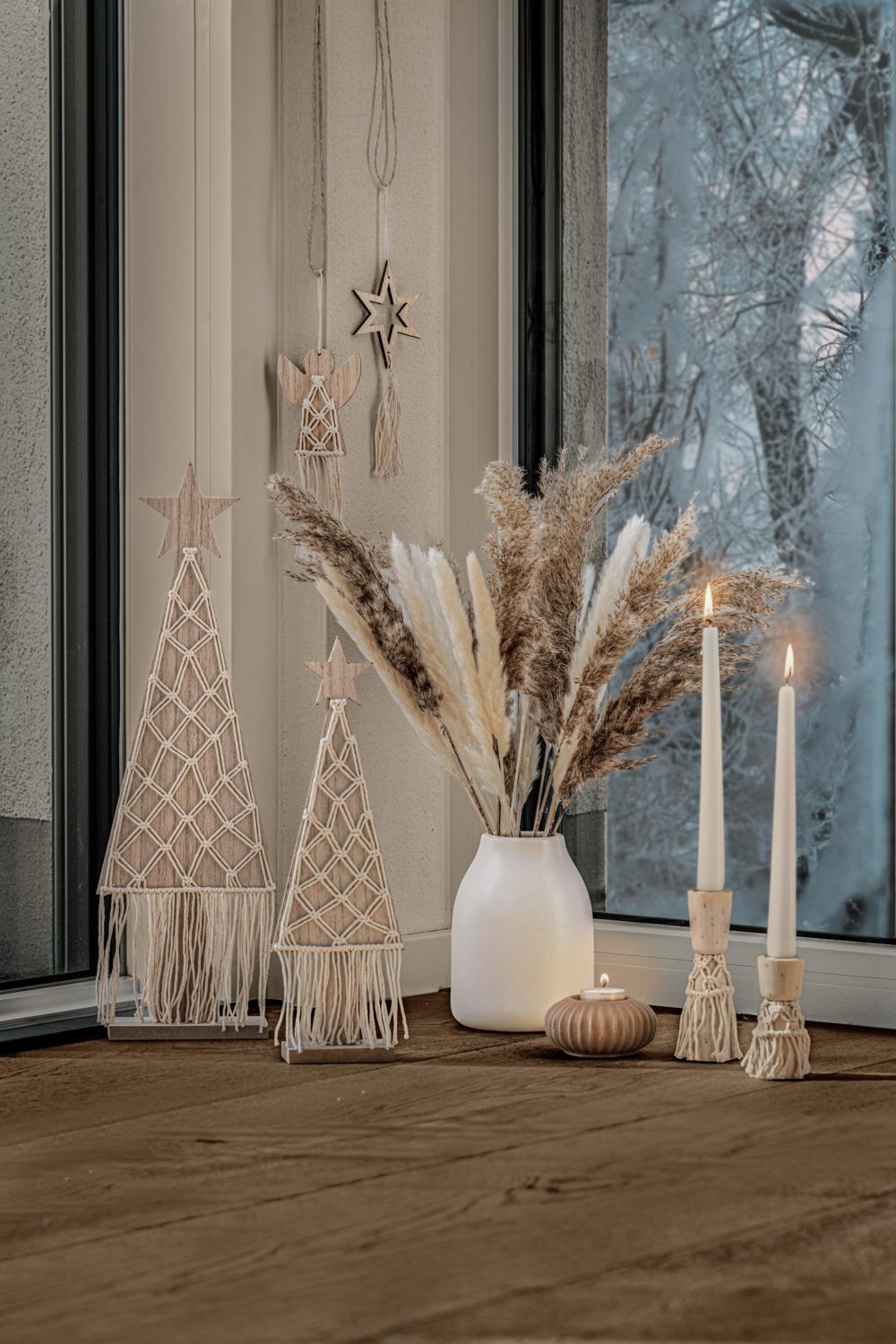 Dekorativni viseći ukras u obliku anđela napravljen od drveta sa pamučnom dekoracijom.