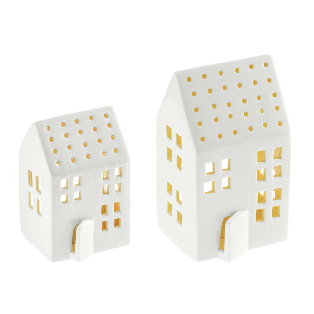 Komplet od dve bele porcelanske ukrasne kućice sa svetlima u dve veličine: 8,8k8,6k15,6 cm i 7,5k6,8k11,5 cm. Naručite odgovarajuće čajne svećice u isto vreme.