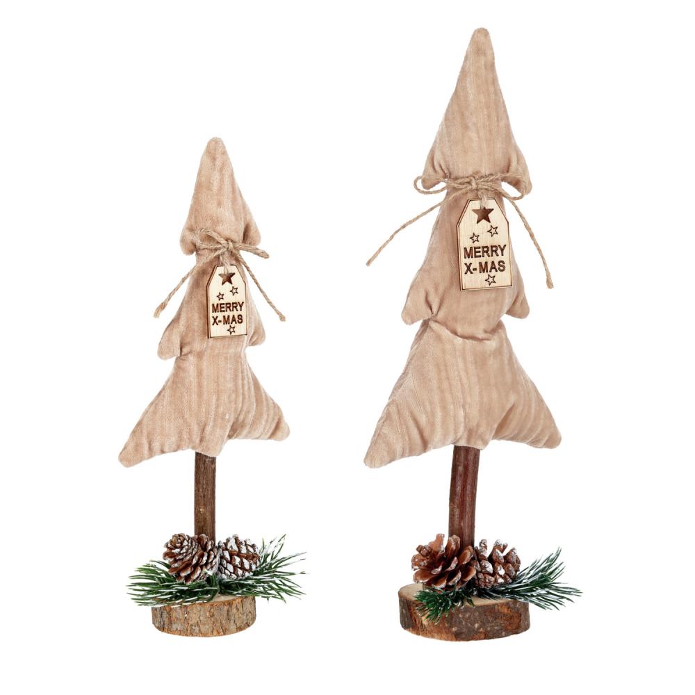 Komplet od dva ukrasna drveta visine 35 cm i 28 cm od braon materijala i prirodnog ukrasa.
