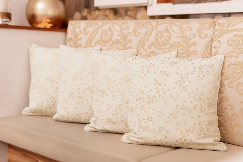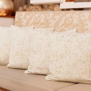 Satenska jastučnica sa zlatnim zvijezdama za božićnu sezonu. Sa rajfešlusom i zaštitom od mrlja, laka za peglanje i jednostavna za čišćenje. Materijal: 100% poliester 40 °C pranje. Težina cca 185 g/m.