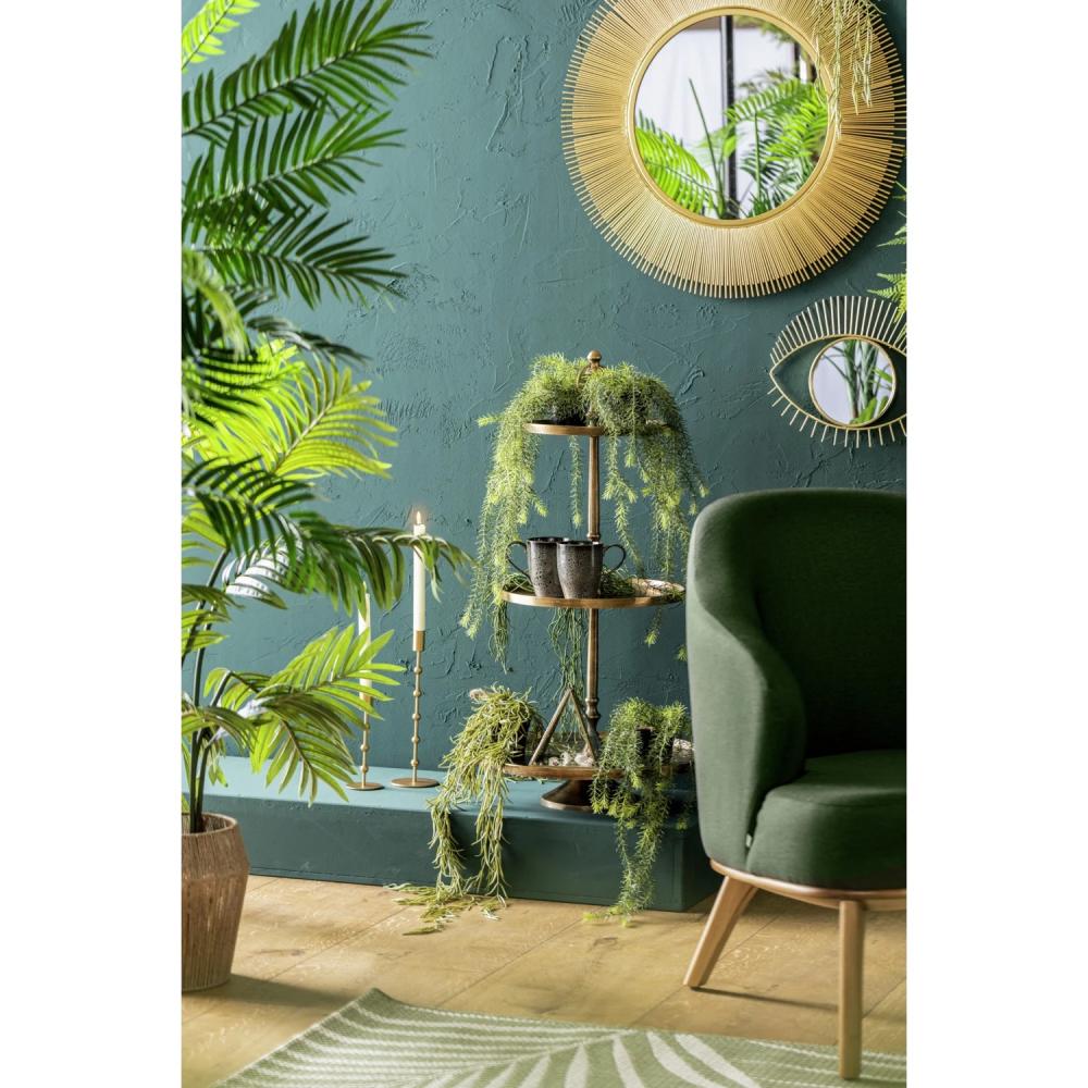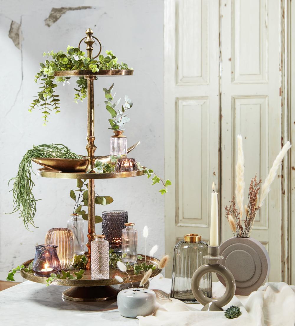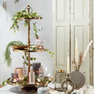 Visokokvalitetni 3-slojni dekorativni stalak u modernom starinskom stilu napravljen od aluminijuma. Dimenzije à ̃ ploča: 45 cm, 34,5 cm i 27,5 cm. Stabilan.