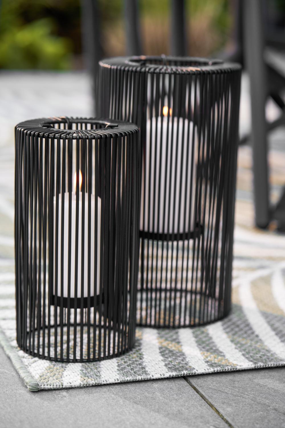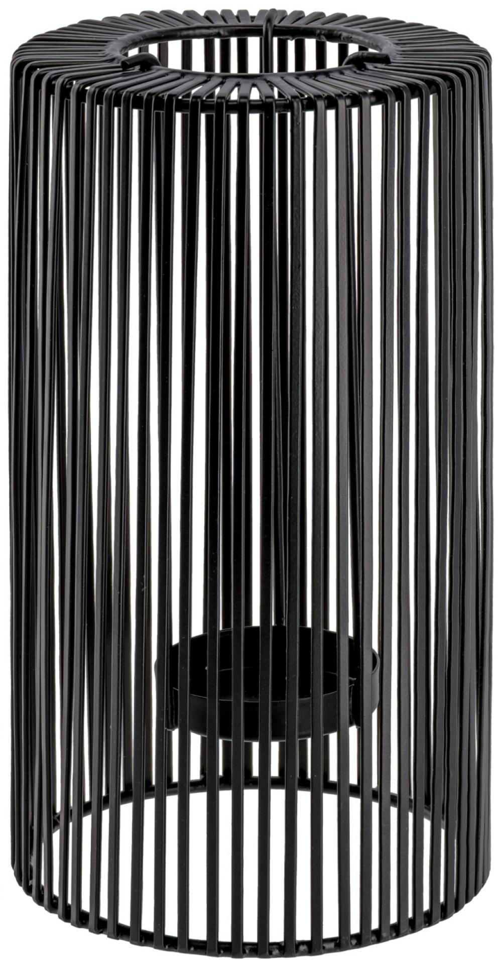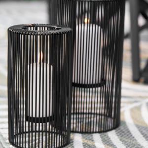 Elegantan fenjer sa ravnim metalnim podupiračima. Držač za sveće koji se može ukloniti sprečava gorenje prstiju.
