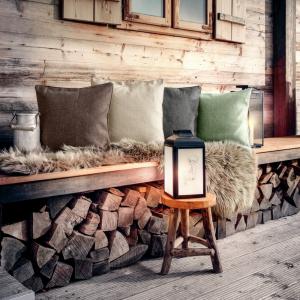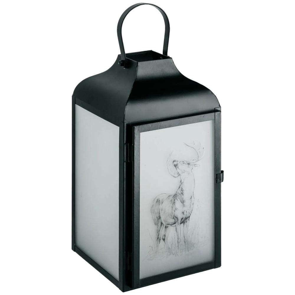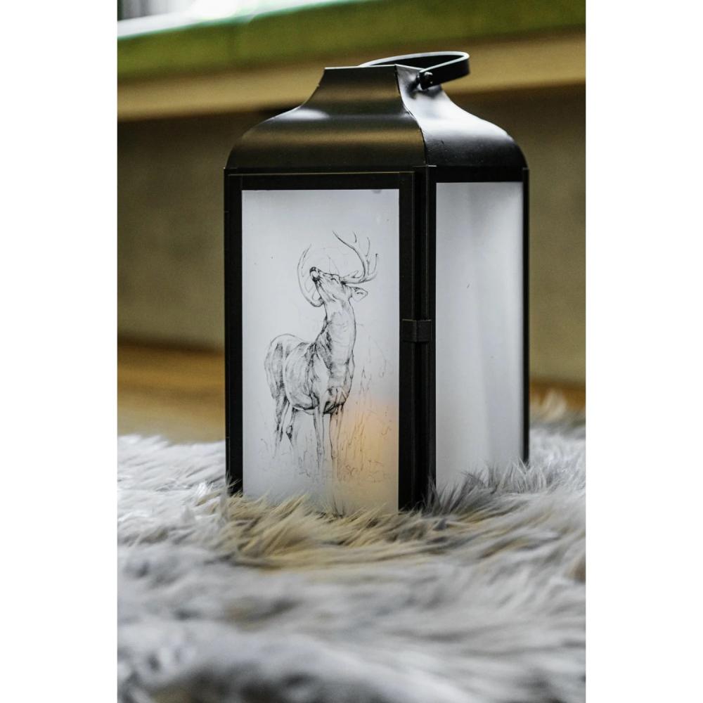 Fenjer napravljen od crnog metala sa staklima, na jednom oknu je jelenski motiv. Sa integrisanom LED svijećom. Isporučuje se bez baterija.