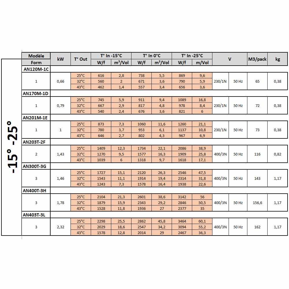 Kapacitet hlađenja 817 (W/f) za zapreminu komore 4,8 m³ / 4800 Lit (T° unutrašnji -20° C & T° spoljni +32° C).