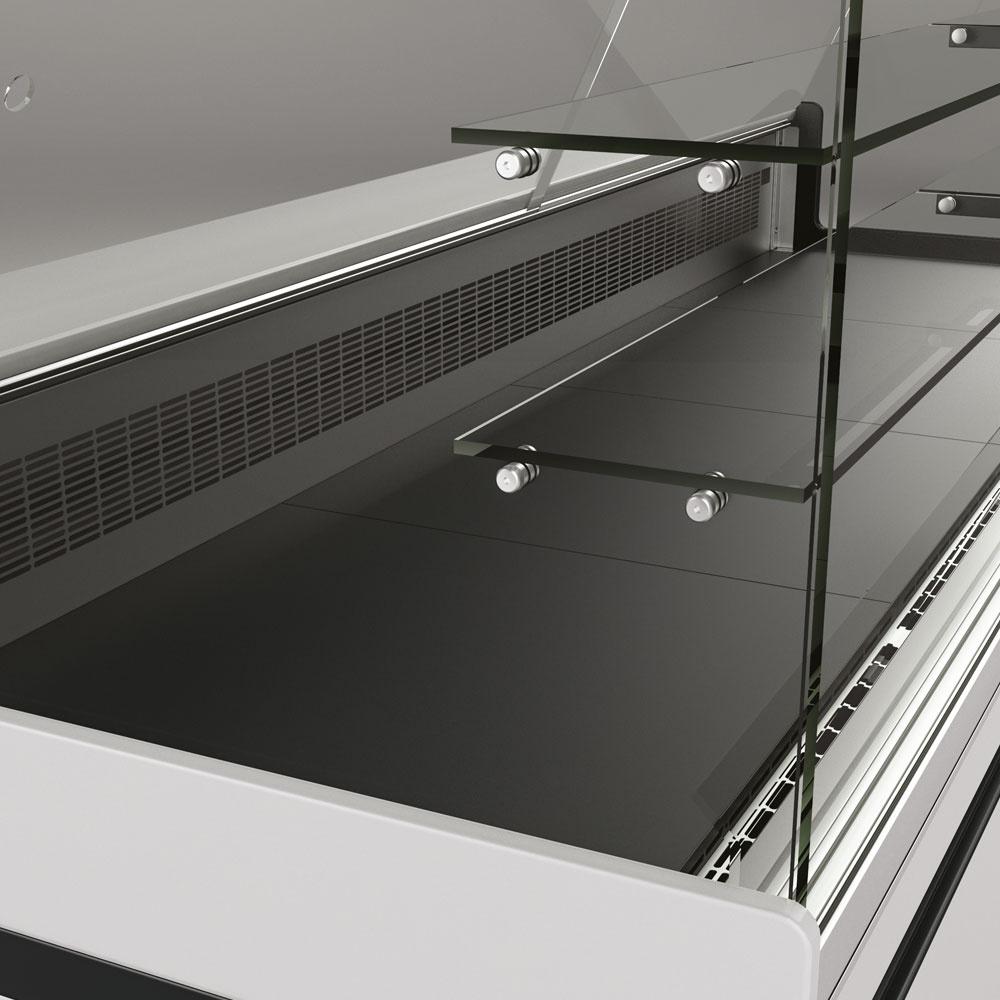 - Stakla od kaljenog stakla (Ektra Clear), 90° otvaranje i preklapanje prednjeg stakla sa sigurnosnim zaustavljanjem (lako održavanje) i integrisanim uređajem protiv zamagljivanja (niskog napona 12V) u šarkama, bočna stakla sa integrisanim uređajem protiv zamagljivanja (niski napon 12V ), srednja polica kao standard. - EURONORM i GASTRONORM vitrine od nerđajućeg čelika AISI 304, sa zaobljenim uglovima i ivicama, dubine 604 mm, standardno se isporučuju - Vitrine koje se mogu skinuti, od nerđajućeg čelika, obojene - Deflektor od pleksiglasa, koji omogućava homogenu distribuciju temperature - Međupolica noseće strukture (s) od nerđajućeg čelika AISI 304 - LED osvetljenje (dvoredni), sa prekidačem za uključivanje-isključivanje - Servisna strana: radna polica od nerđajućeg čelika AISI 304 sa uređajem protiv zamagljivanja (niski napon 12V) koji se nalazi ispod, klizna vrata od pleksiglasa, oblikovan tako da se poravna sa bočnim staklima - Ugrađena kompresorska jedinica, klimatska klasa 3 - Rashladni gas R290 - Ventilisani isparivač, tretiran protiv korozije od prehrambenih kiselina - Automatsko odmrzavanje, sa automatskim isparavanjem kondenzata. - Okvir od plastificiranog čeličnog lima, poliuretanska izolacija bez CFC-a, podesive noge od nerđajućeg čelika (klizne) za savršeno podešavanje (na zahtev: AP = sa uređajem za podršku platforme ´servis step´, ili SP = standardno bez uređaja). - Jedinica izgrađena u skladu sa (CE) standardima koji su na snazi.