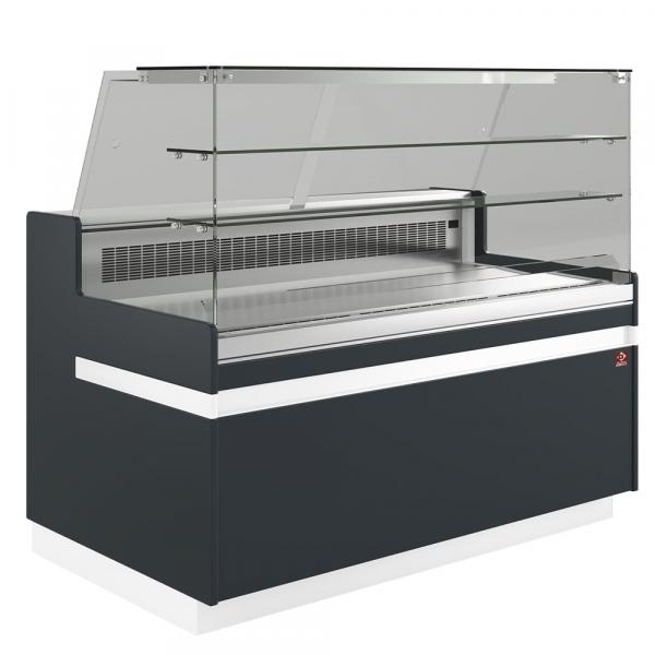 Ventilirano hlađenje - Niski visoki prozori, sa 2 srednje police - EURONORM i GASTRONORM displej, police koje se mogu ukloniti u ANTRACIT boji - Bočne strane i zabat od drveta, melaminska površina i ivica od ABS-a, CRNA boja (kod. A), lajsne i aluminijumske lajsne. BELA (kod. 1) - Radna polica od nerđajućeg čelika (kod. Ks)