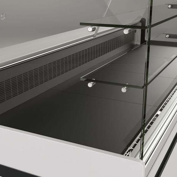 Staklena od kaljenog stakla (Ektra Clear), 90° otvaranje i preklapanje prednjeg stakla sa sigurnosnim zaustavljanjem (lako održavanje) i integrisanim uređajem protiv zamagljivanja (niski napon 12V) u šarkama, bočna stakla sa integrisanim uređajem protiv zamagljivanja (niski napon 12V) , srednja polica kao standard.