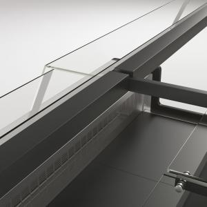 Staklena od kaljenog stakla (Ektra Clear), 90° otvaranje i preklapanje prednjeg stakla sa sigurnosnim zaustavljanjem (lako održavanje) i integrisanim uređajem protiv zamagljivanja (niski napon 12V) u šarkama, bočna stakla sa integrisanim uređajem protiv zamagljivanja (niski napon 12V) , srednja polica kao standard.