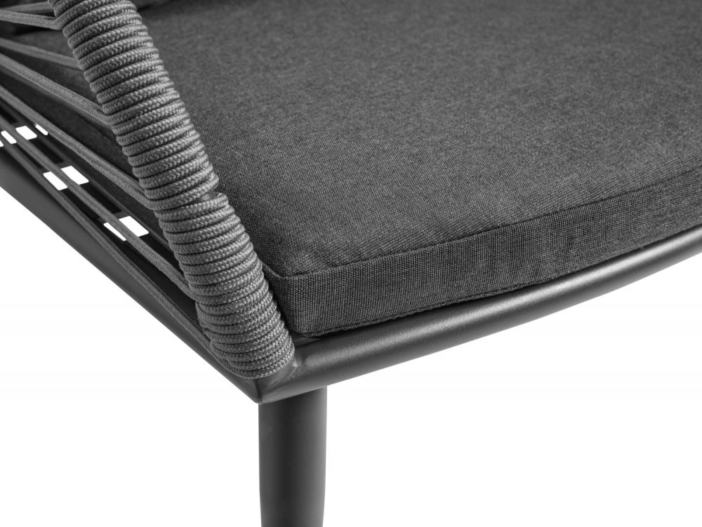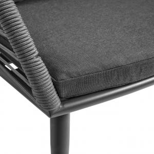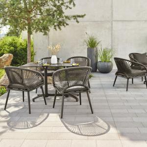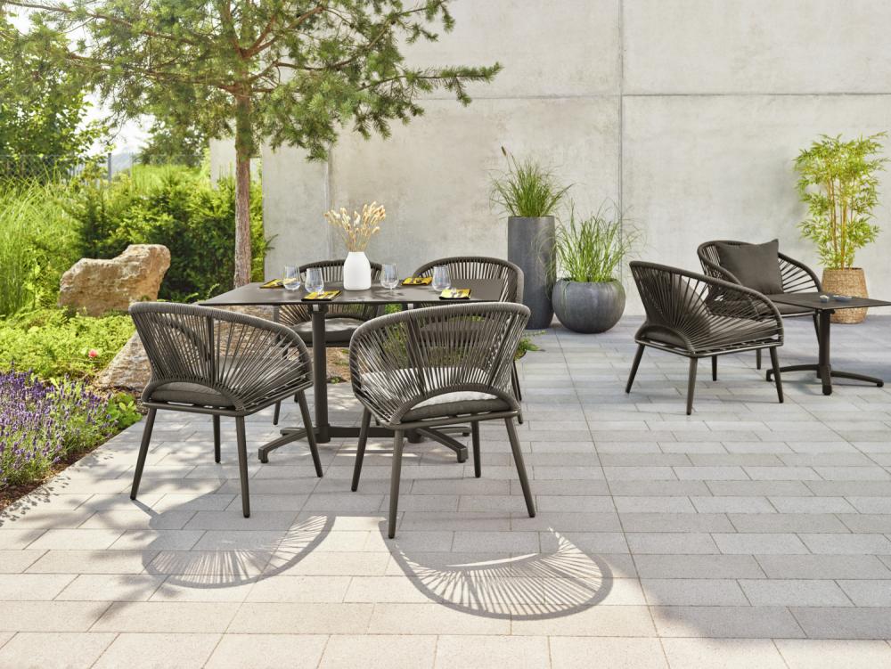 Privlačna serija Alcamo napravljena od konopaca u kombinaciji sa aluminijumom obloženim prahom je simbol elegancije u bilo kom spoljnom prostoru. Serija se sastoji od stolica i fotelja koje se mogu međusobno kombinovati za trpezariju ili salon. Dostupan u prirodnom harmoničnom bež tonu, ili u modernom antracit sivoj. Otporan na vremenske uslove i veoma jednostavan za čišćenje. Prljavština se može lako ukloniti vlažnom krpom, visoki nivo udobnosti sjeđenja. Pored toga, može se naručiti odgovarajući jastuk za leđa.
