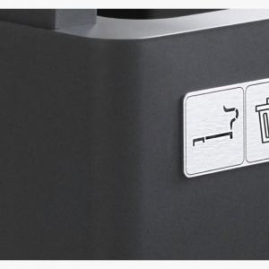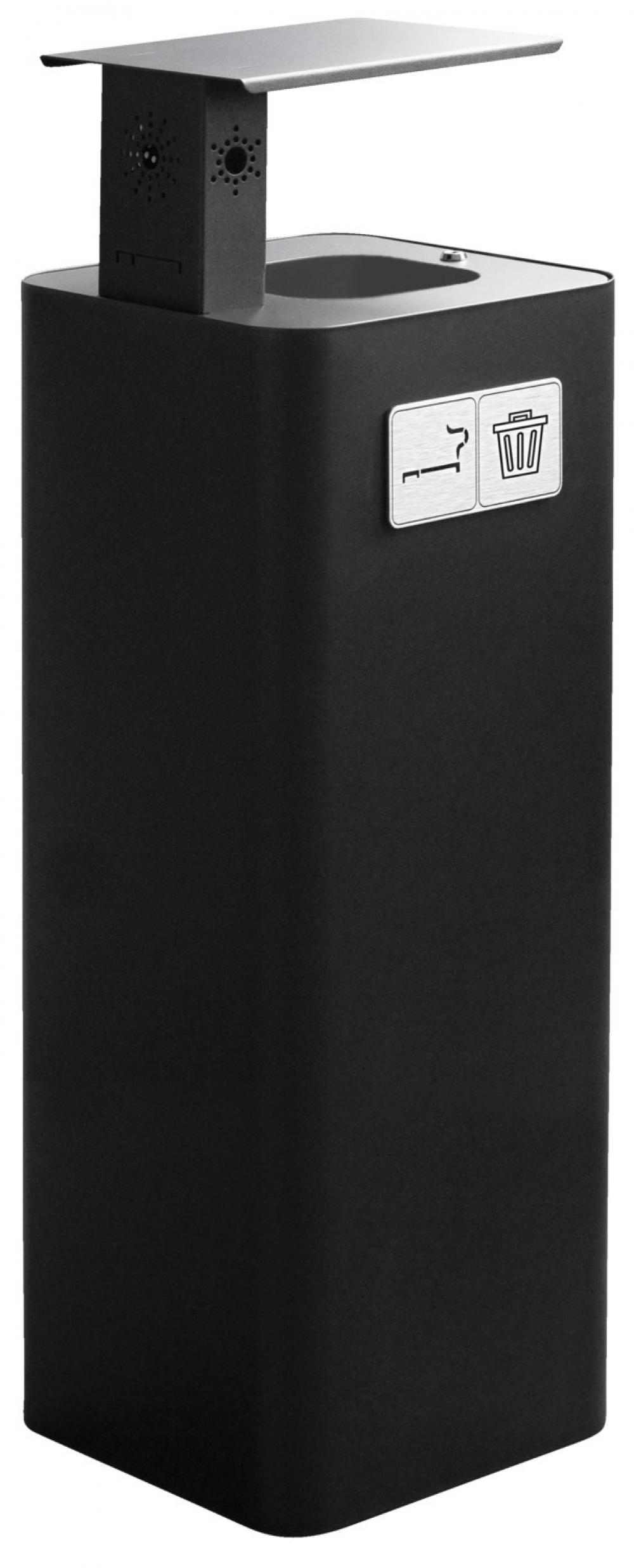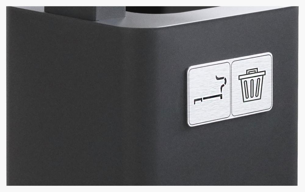 Elegantna i funkcionalna pokrivena kanta za otpatke sa pepeljarom i poklopcem, u potpunosti izrađena od pocinkovanog, crno obojenog čelika. Pure ima bočne rupe za gašenje cigareta. Obloga za smeće se ubacuje kroz prsten njegovog držača. Kanta za smeće ima uklonjivu tacnu za sakupljanje opušaka. Držač za cigarete se lako može ukloniti i isprazniti. Uključuje aluminijski kompozitni piktogram sa simbolima "kanta za smeće" i "pepeljara", 1 kg pijeska za pepeljaru i 1 ključ. Korpa je visine 102 cm i kapaciteta 60 l.