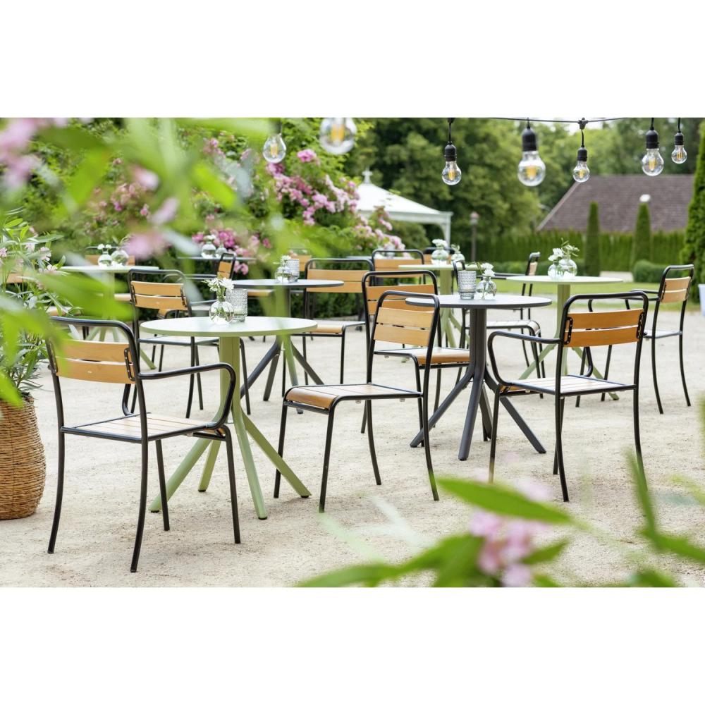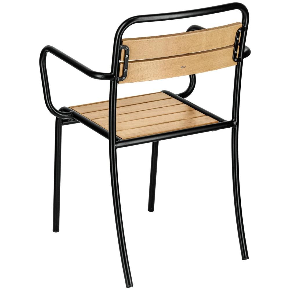 Sa Santo spoljašnjom stolicom sa naslonima za ruke, sada možete da donesete popularni industrijski stil u svoju baštu. Stolica se takođe može koristiti u zatvorenom prostoru i kombinuje različite materijale: crni čelični okvir je elektrogalvanizovan i premazan prahom, dok su sjedište i naslon za leđa napravljeni od lakiranog kestenskog drveta. Dimenzije lamela su: sjedište/zadnje rešetke širine 65 mm. Debljine 17 mm. Do 6 stolica se može složiti.