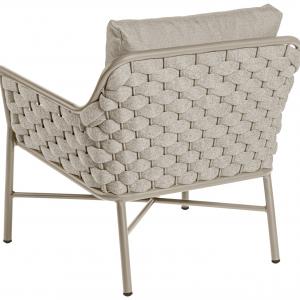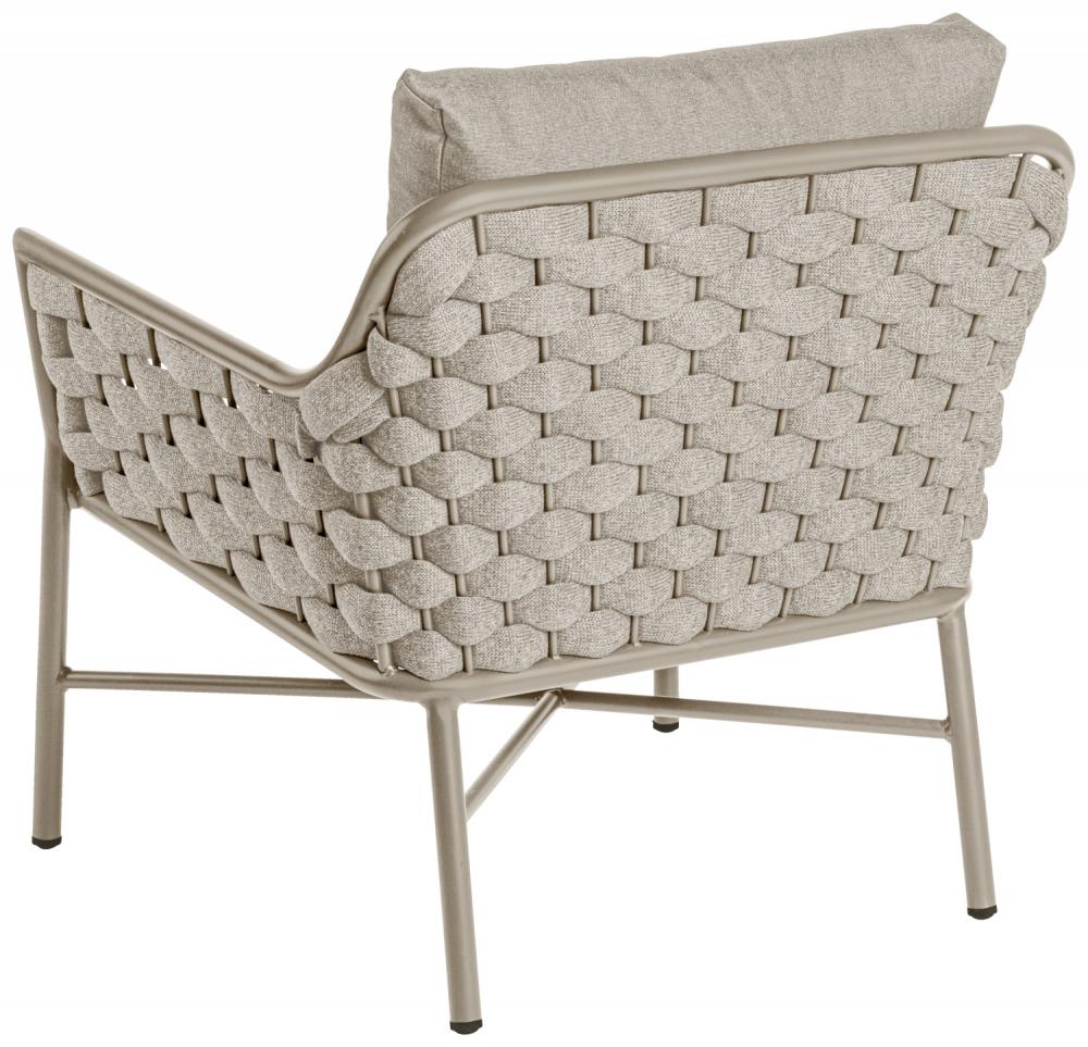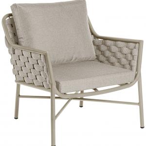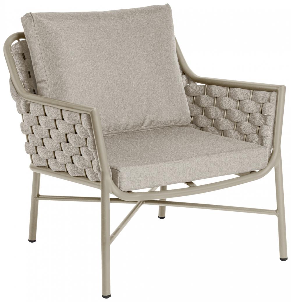 Outdoor chair made of powder-coated aluminum frame and Rope wickerwork (98% polypropylene + 2% polyester yarn). Includes seat cushion made of olefin fabric (100% polypropylene), removable and washable at 30°C. UV-resistant and lightfast. Suitable for outdoor use. Delivered assembled. Order matching sofa or chair at the same time.