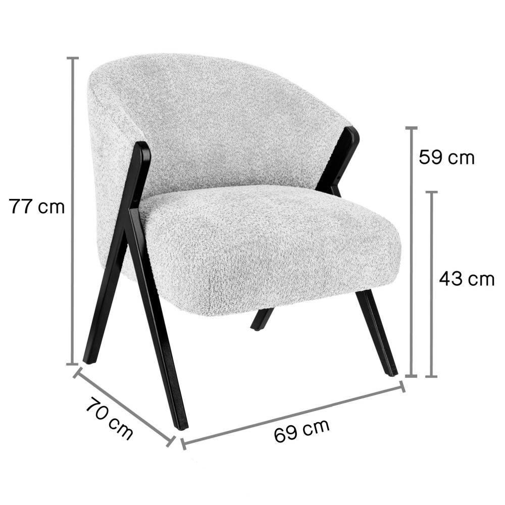 Elegant armchair made of durable fabric (100% polyester) with a stained, varnished beech frame. Includes plastic gliders on the underside. Fire-resistant cover. Only suitable for indoor use. Delivered assembled.