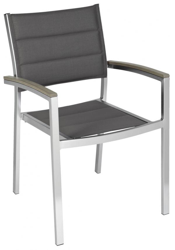 Njen okvir izrađen od čvrstog aluminijuma je opciono obložen optičkim ili antrakitom od nerđajućeg čelika. Posebna prednost ove stolice je veoma udobna podloga napravljena od izdržljivog i jednostavnog tekstilnog materijala i pjene koja se brzo suši. Otporna na vremenske uslove. lako se čisti.