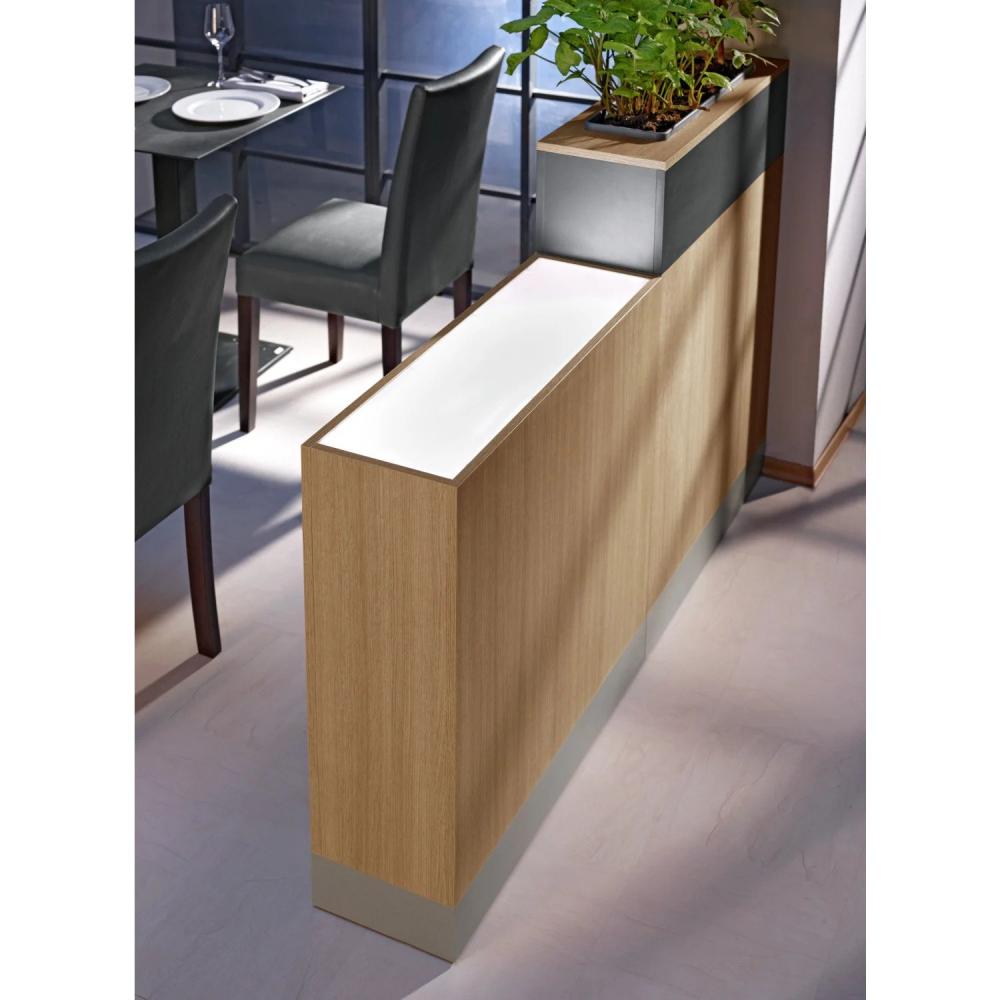 Ako tražite maksimalno konvertibilni sistem razdvajanja koji se može slobodno koristiti u prostoriji ili na zidu, ova pregrada sobe je veoma dobar izbor! Osnovni element u prirodnoj optici drveta dostupan je u dekorativnim bojama hrasta i duhana ili moke i antrakita, koji je hvatač očiju u kombinaciji s bazom kontrasta boja u optici od nehrđajućeg čelika. Visina separatora prostora određena je brojem elemenata kao i različitim pločama za umetanje, npr. za biljne posude. U kombinaciji sa umetnutom pločom bijelog obloženog stakla, pregrada prostorije se čak može osvijetliti, posebno jer je kontinuirani kablovski kanal za nevidljivo pričvršćivanje električnog sistema prisutan u osnovnom elementu. Svi predmeti se isporučuju sastavljeni, pojedinačni elementi se lako mogu sastaviti. Individualno kombinovano!