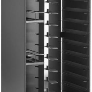 Kolica za čišćenje poslužavnika sa centralnim stubom, koja se mogu podesiti u nekoliko jednostavnih koraka (moguće 26 do 40 cm). Tako se kolica za čišćenje poslužavnika prilagođavaju vašim poslužavnicima. Kolica za čišćenje poslužavnika nude prostor za 14 poslužavnika, visina umetaka poslužavnika: 11 cm. 3 visinske podesive korpe za boce. Do 8,5 l flaša se može postaviti po odeljku. Zbog mogućnosti razdvajanja kontejnera za piće i hranu, kolica za čišćenje poslužavnika mogu se optimalno koristiti. Pored toga, može se istovremeno utovariti i istovariti po potrebi (bez ugrađenog zadnjeg zida). Svi kasteri su upravljani, od kojih dva imaju parking kočnicu. Teški plastični kasteri rade veoma tiho i otporni su na hrđu sa svojim ležajevima od nerđajućeg čelika. Zbog visokokvalitetnog materijala od laminata i plastike, kolica su veoma robusna i mogu se koristiti i u zaštićenim spoljnim prostorima. Isporučeno okupljeno. Rezervni panel se može naručiti opcionalno. Materijal: laminat, nehrđajući čelik i plastika. VEGA sopstveni dizajn - dostupan samo od nas! Vlažno brisanje! Vodootporan!