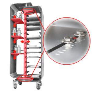 can be wiped with a damp cloth Height adjustable bottle baskets Height adjustable central column Simultaneous loading and unloading Steerable castors water-repellent |