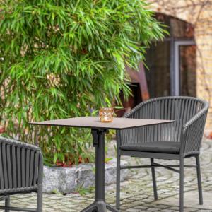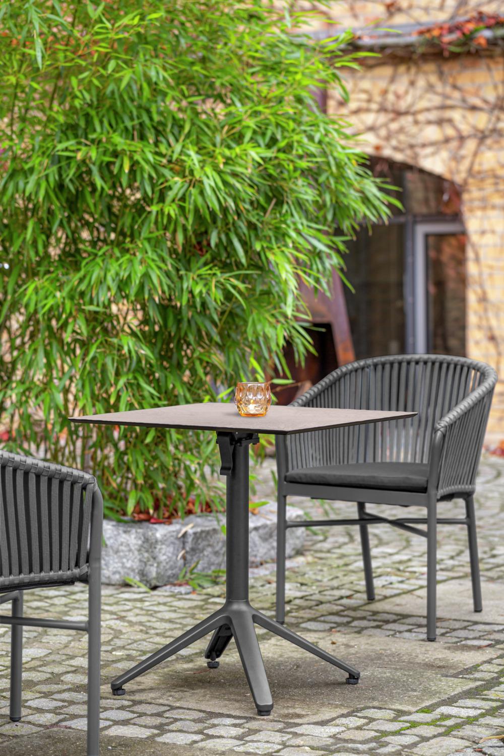 Pachino sto se sastoji od stabilnog postolja izrađenog od aluminija obloženog prahom i stone ploče LIFT u boji betona. Postolje sa sklopivim stolnim krstom i uspravnim stopalima nudi vašim gostima više prostora za noge.