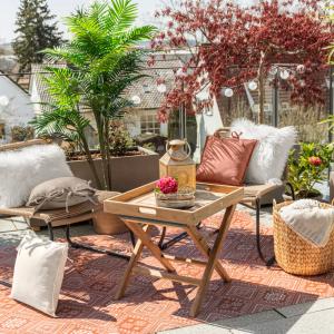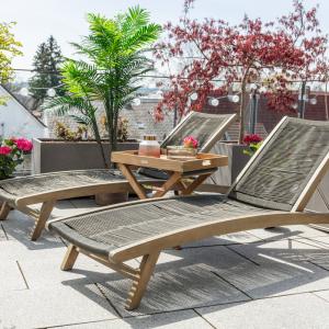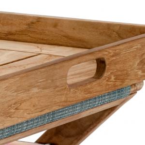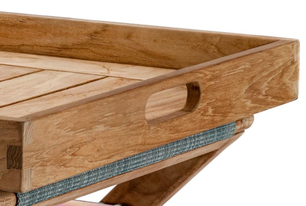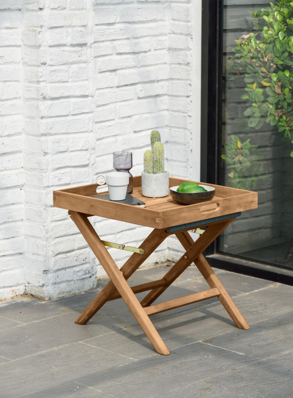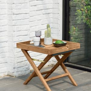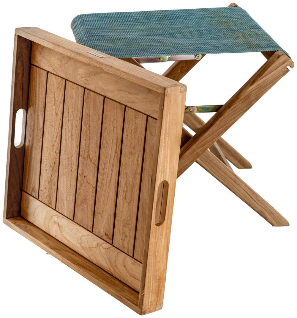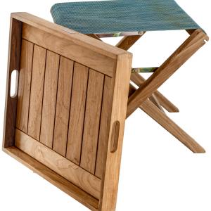 Stočić s poslužavnikom napravljen od netretirane tikovine sa FSC sertifikatom, sa PVC tekstilnom oblogom. Uklonjivi poslužavnik dimenzija 49.5×55×6 cm (Š×D×V). Dimenzije kada je sklopljen: 12×46×65 cm. Nije namenjen za korišćenje kao stolica; maksimalno opterećenje 60 kg. Pogodan za spoljašnju upotrebu. Isporučuje se sklopljen.
