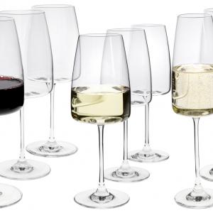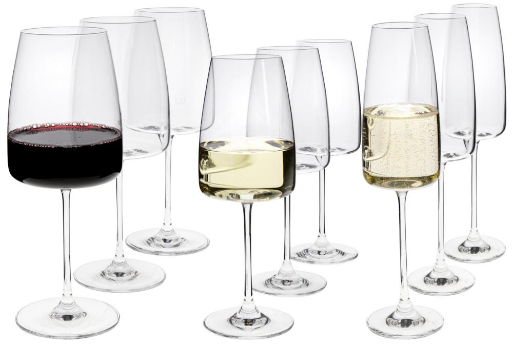 18-piece set of six each red wine, white wine and sparkling wine glasses. Dishwasher safe.