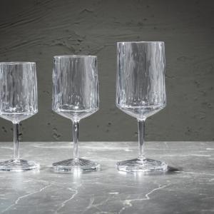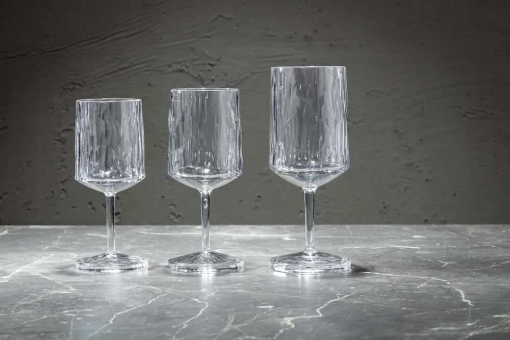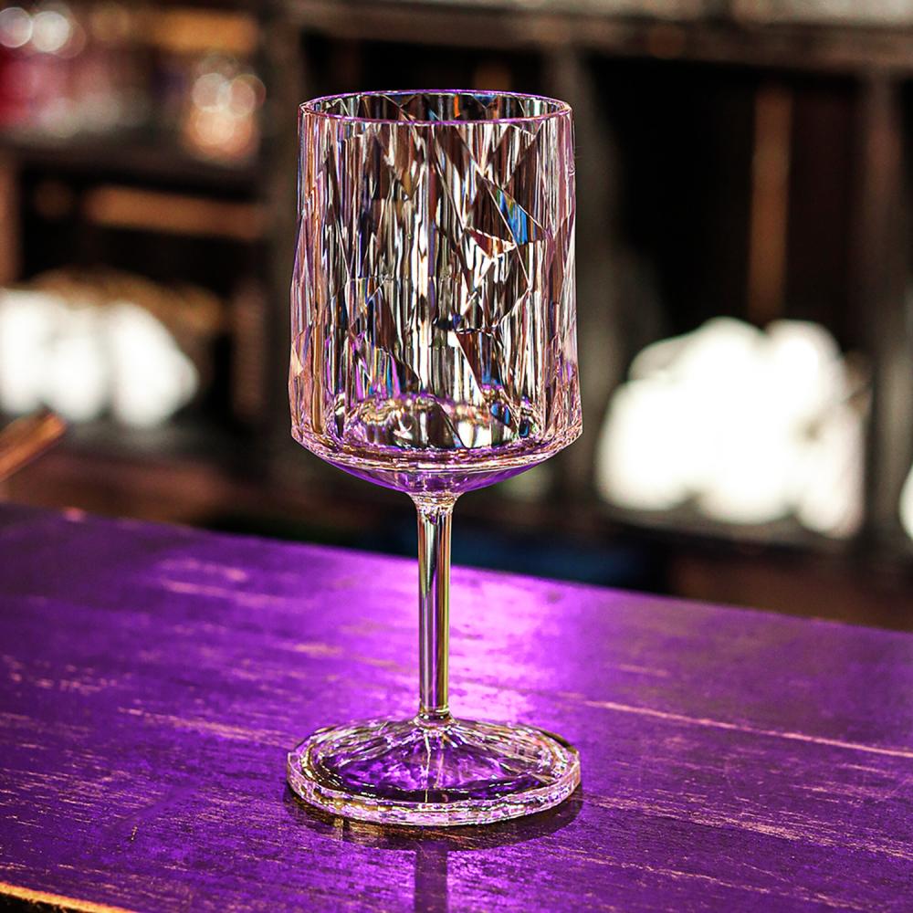 The Superglas is made of unbreakable high-tech plastic material in an attractive faceted design for red wine, spritz or cocktails. Meets the legal requirements for all areas where glass is prohibited. Insulates four times better than conventional glass. Impact-resistant, recyclable, suitable for dishwasher up to max. 70°C, rinse new glasses at over 80°C for the first time, pH-neutral cleaning agents and special rinse aid recommended for plastic glasses. Finishing from 288 pieces with your desired logo as an imprint is also possible.
