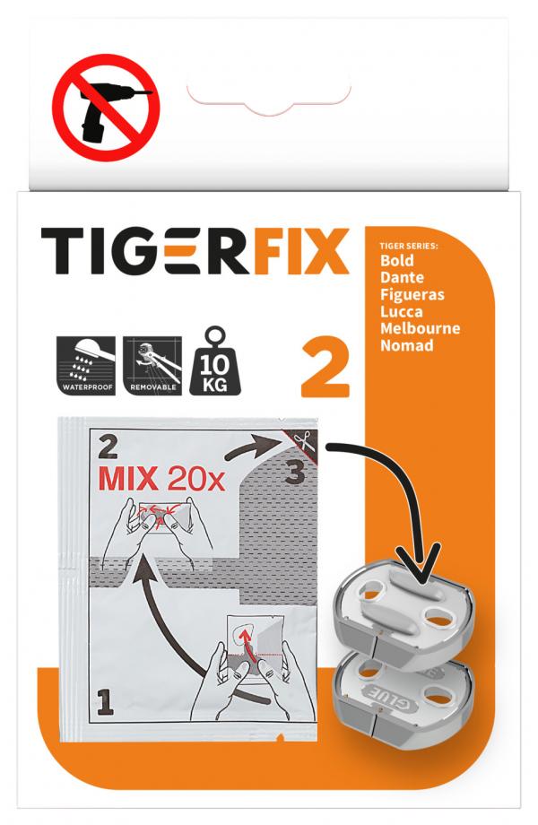 Sa patentiranim TigerFix sistemom lepka tipa 2, Tiger pribor se može brzo i lako pričvrstiti na glatke, tvrde površine. Nakon miješanja ljepila, može se lako nanijeti na zidnu ploču i nakon 4 sata možete pričvrstiti dodatak. Glavna prednost TigerFix je da se zidna ploča može lako ukloniti bez oštećenja. TigerFix tip 2 je pogodan za gotovo praćenje kupatila iz serije Tiger: Bold, Dante, Figueras, Lucca, Nomad i Melbourne. * Pogodan za upotrebu u kupatilu * Nije potreban alat * Veoma jaka sila držanja, maksimalni nosivost 10 kg