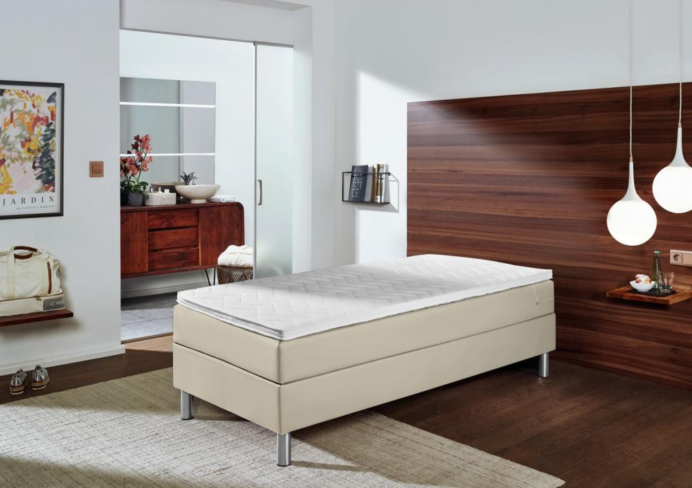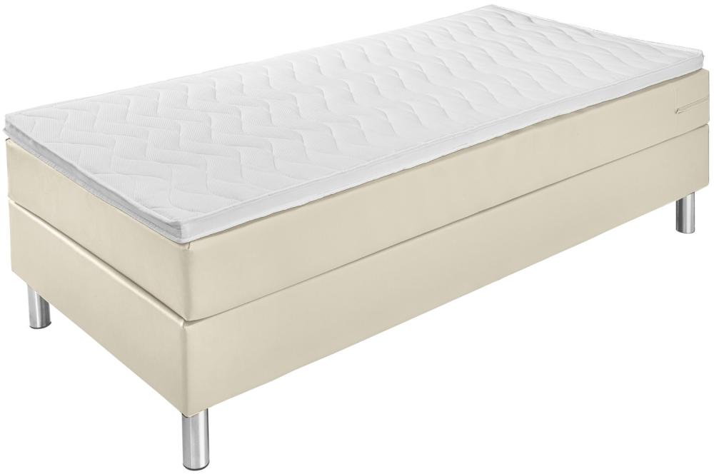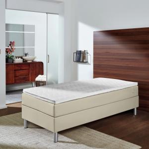 Proljetni krevet u praktičnom kompletu. Kutija sa bonnell spring core. Čvrsti drveni okvir. 7 zona džepnog proljetnog dušeka. Hladna pjena topper za udoban san. Bez uzglavlja. Srebrna čelična stopala. Visina za ulazak u krevet: 60 cm. Visina: Stopala 16 cm + kutija 22 cm + dušek 17 cm + topper 5 cm; Ukupna visina: 60 cm. Sa imitacijom kožnog pokrivača. Dostupno kao jednokrevetni ili dupli krevet. Isporučuje se sa povezanim elementima. Dostupan u krem bijeloj i sivoj boji.
