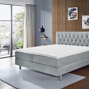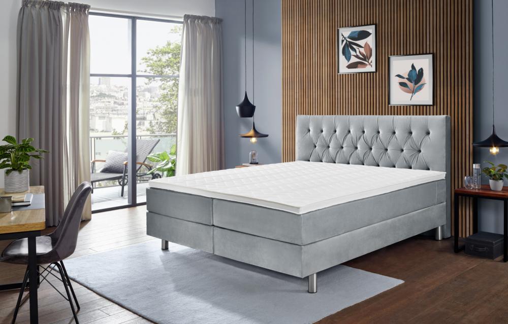 Proljetni krevet u praktičnom kompletu. Kutija sa džepnim oprugama. Čvrsti drveni okvir. 7 zona džepnog proljetnog dušeka. Gel pjena topper za udoban san. Uzglavlje sa klasičnim Chesterfield quiltingom. Srebrna čelična stopala. Visina za ulazak u krevet: 69 cm. Visina: Stopala 16 cm + kutija 27 cm + dušek 21 cm + topper 5 cm; Ukupna visina: 69 cm Sa velurovim pokrivačem. Dostupno kao jednokrevetni ili dupli krevet. Isporučuje se sa povezanim elementima. Dostupan u sivoj i tamnoplavoj boji.