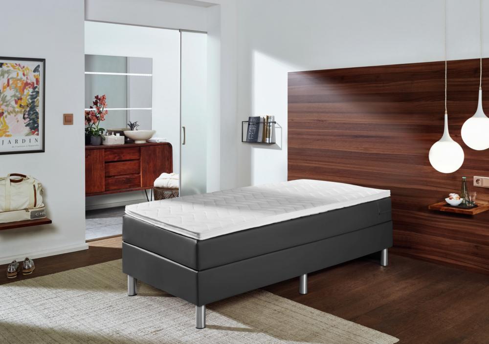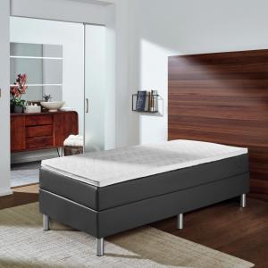 Proljetni krevet u praktičnom kompletu. Prazna kutija. Chipboard okvir. 5-zonski džepni proljetni madrac. Hladna pjena topper za udoban san. Bez uzglavlja. Srebrna čelična stopala. Visina za ulazak u krevet: 58 cm. Visina: Stopala 16 cm + kutija 20 cm + dušek 17 cm + topper 5 cm; Ukupna visina: 58 cm. Sa imitacijom kožnog pokrivača. Dostupno kao jednokrevetni ili dupli krevet. Isporučuje se sa povezanim elementima. Dostupan u sivoj i krem bijeloj boji.
