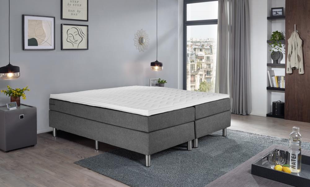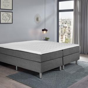 Proljetni krevet u praktičnom kompletu. Prazna kutija. Chipboard okvir. 5-zonski džepni proljetni madrac. Hladna pjena topper za udoban san. Bez uzglavlja. Srebrna čelična stopala. Visina za spavanje: 58 cm Visina: Stopala 16 cm + kutija 20 cm + dušek 17 cm + topper 5 cm; Ukupna visina: 58 cm. Sa presvlakama tkanine. Dostupno kao jednokrevetni ili dupli krevet. Isporučuje se sa povezanim elementima. Dostupan u sivoj, antracit i taupe boji.