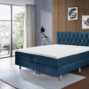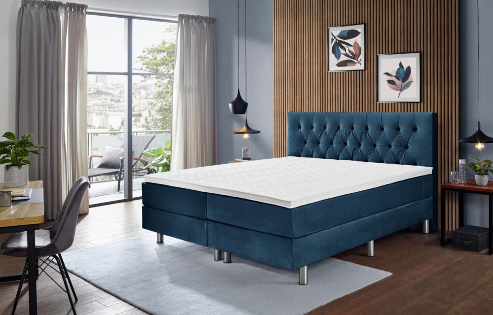 Proljetni krevet u praktičnom kompletu. Prazna kutija. Chipboard okvir. 5-zonski džepni proljetni madrac. Hladna pjena topper za udoban san. Uzglavlje sa klasičnim Chesterfield quiltingom. Srebrna čelična stopala. Visina za ulazak u krevet: 58 cm. Visina: Stopala 16 cm + kutija 20 cm + dušek 17 cm + topper 5 cm; Ukupna visina: 58 cm. Sa velurovim pokrivačem. Dostupno kao jednokrevetni ili dupli krevet. Isporučuje se sa povezanim elementima. Dostupan u tamnoplavoj i svijetlosivoj boji.