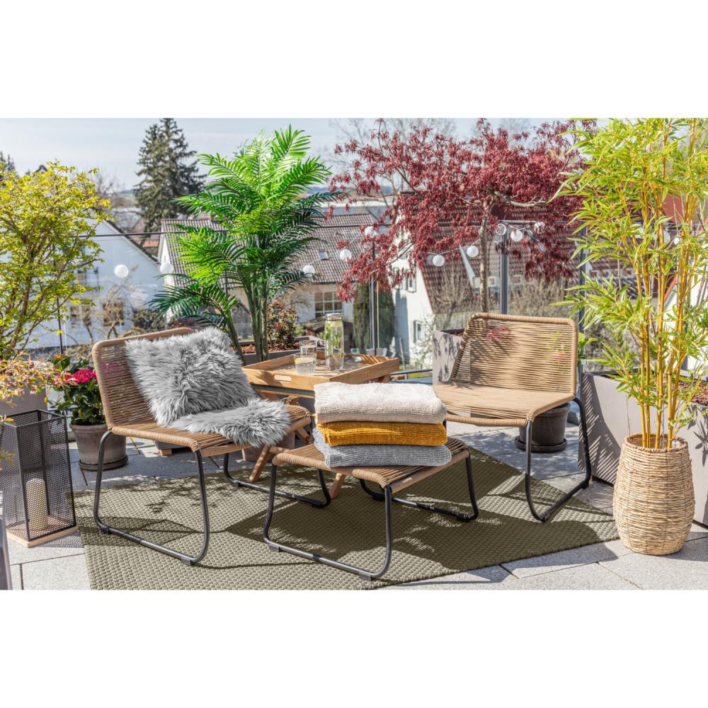 Moderno vanjsko ćebe napravljeno od poliestera za jednostavnu njegu i brzo sušenje, održavat će vaše goste toplim u hladnim večernjim satima. Dostupno u prirodnim nijansama, pogodno za bilo koji ambijent! 100% poliester, 30°C nježno pranje. Težina cca 768 g.